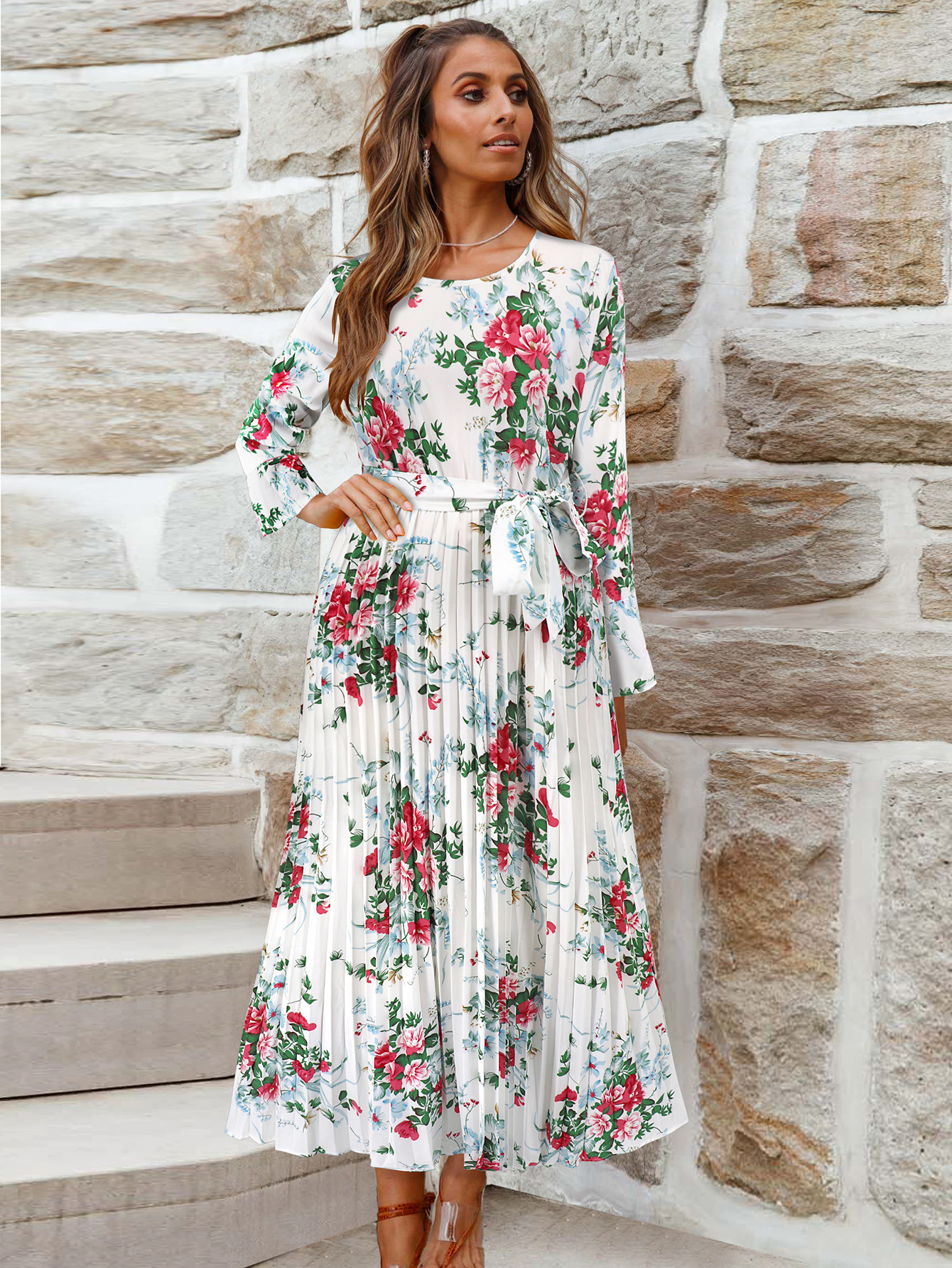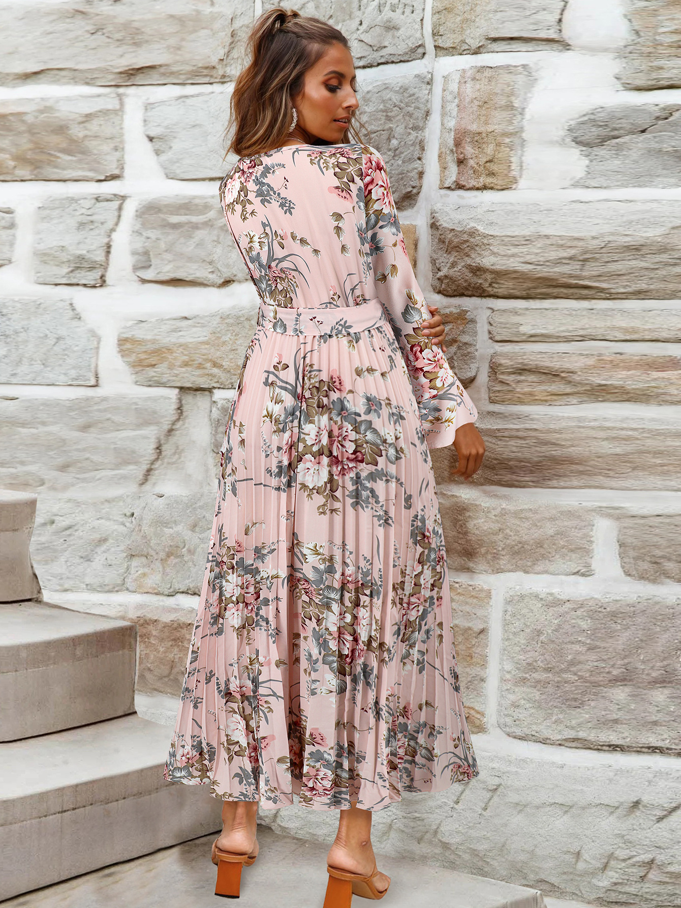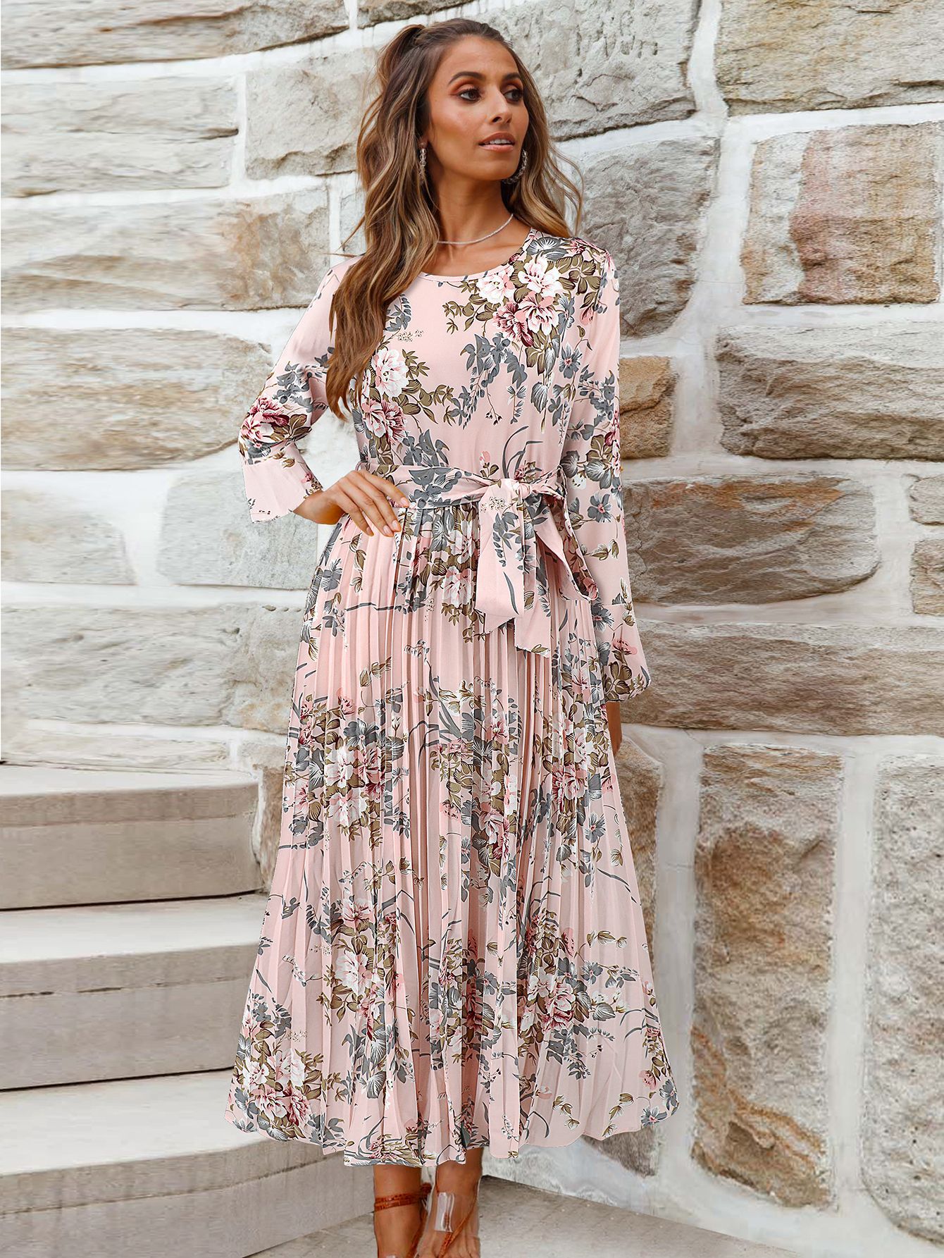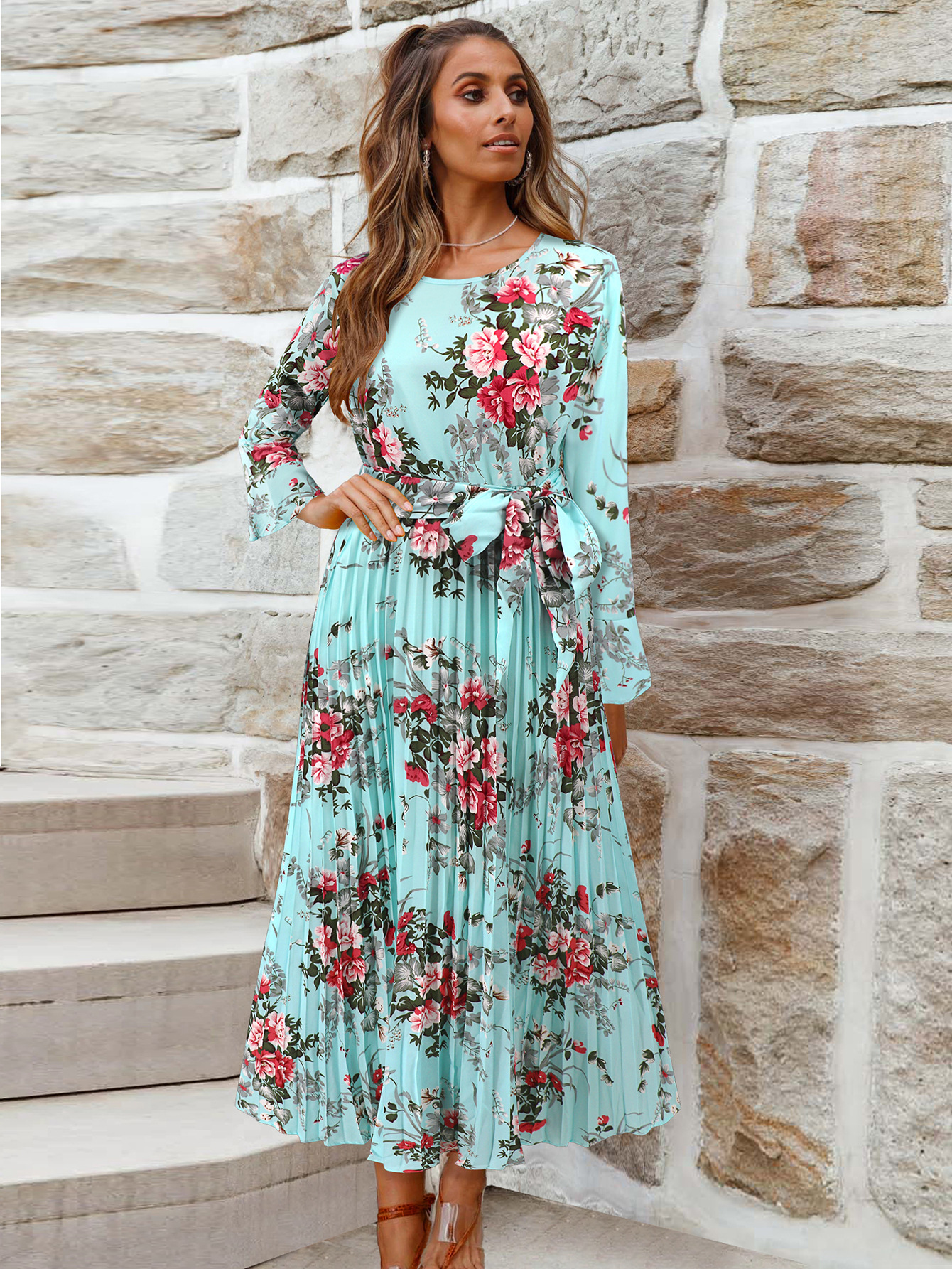 Bell-Sleeved Bohemian Pleated Print Dress for Women