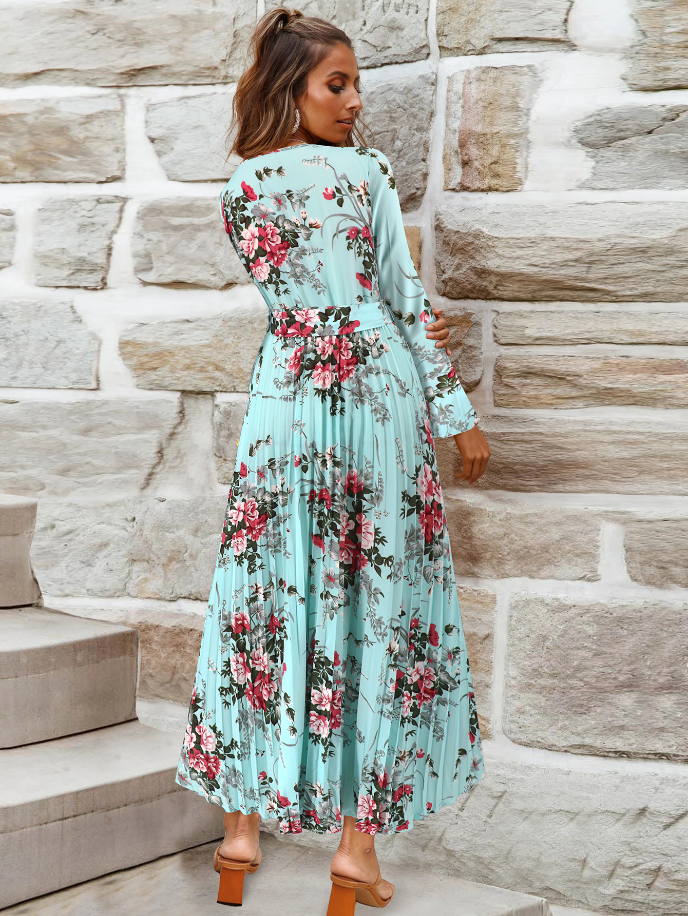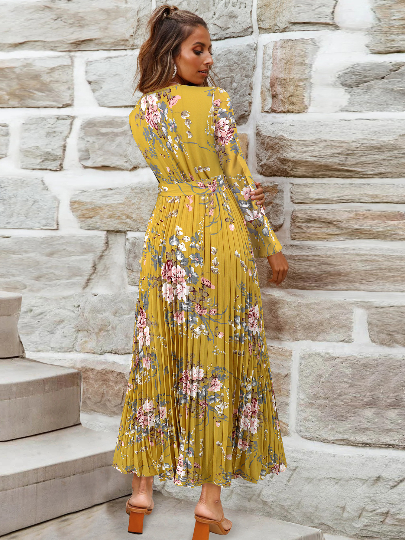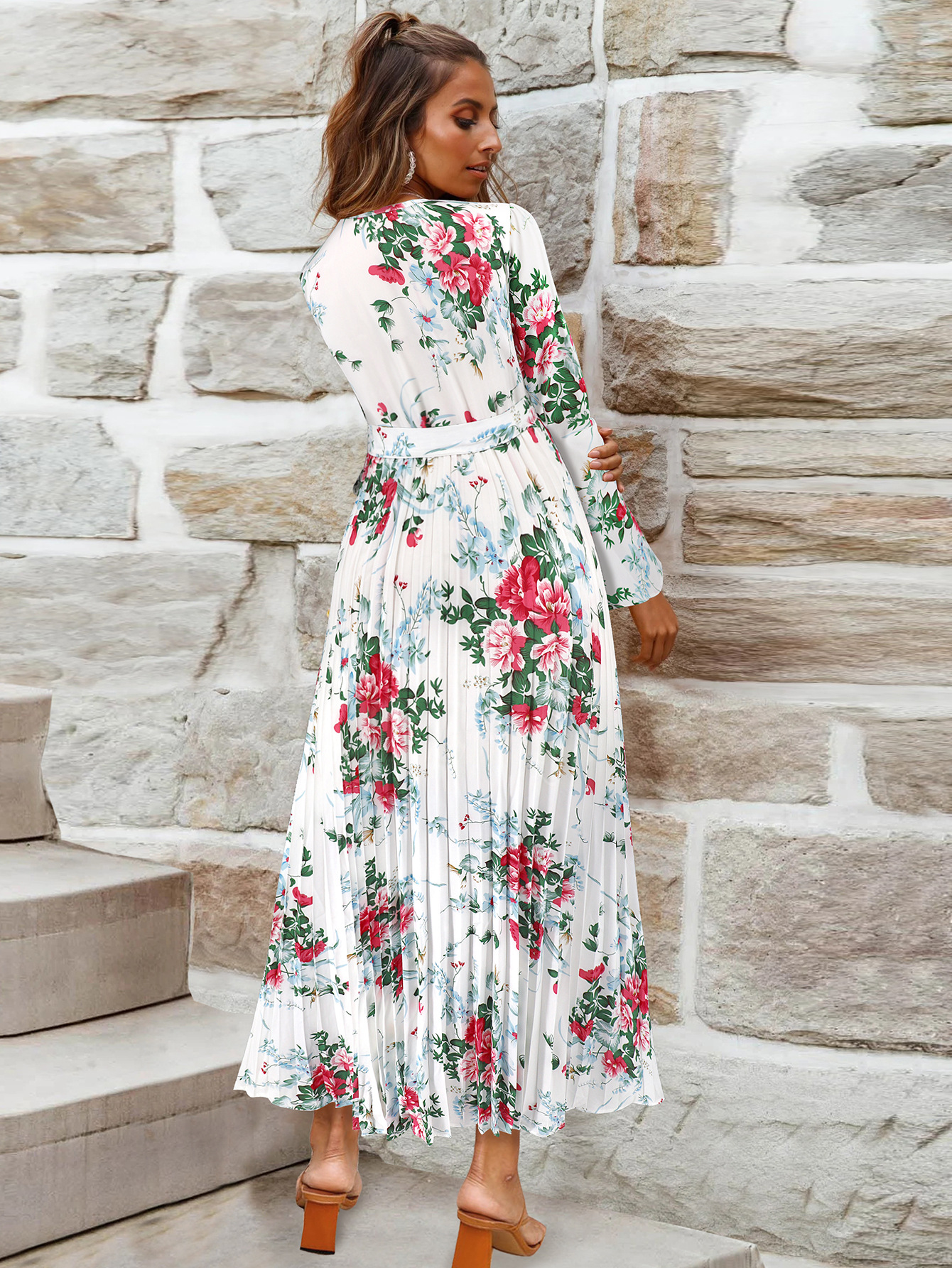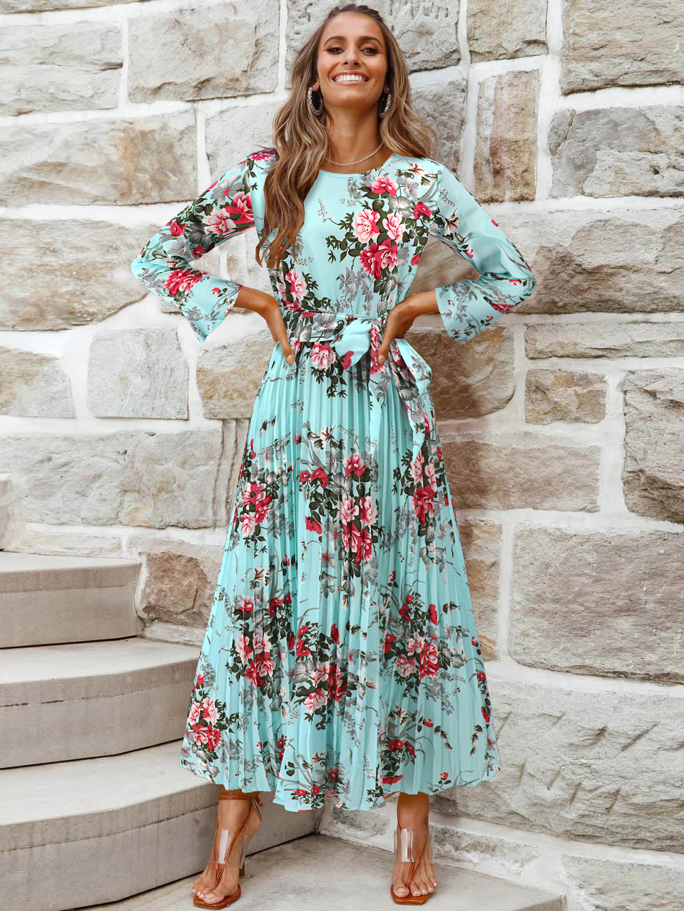 Bell-Sleeved Bohemian Pleated Print Dress for Women